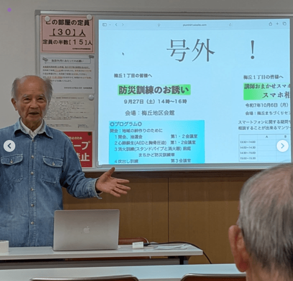 9月27日、梅丘1丁目町会防災訓練。 消防団員として初期消火訓練をお手伝い。 いざ火災が発生しても、身の丈位の火なら消火器で消せますがそれ以上なら逃げてください。 また、消火器はもって35秒位しか消火剤は出ないので、危険のない範囲で近くによってからハンドルを握って、消火剤を火元にかける様にお伝えしました。