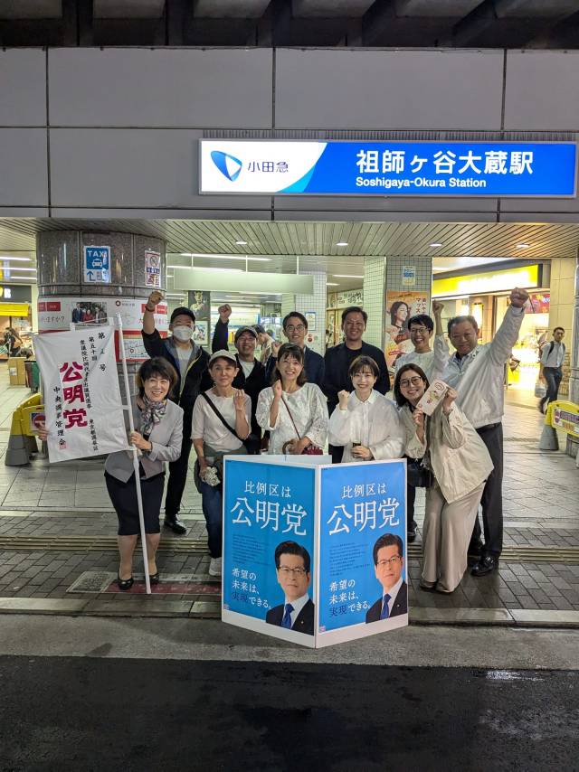 10月18日夜7時から祖師ヶ谷大蔵駅にて、比例区は公明党のビラを配布。