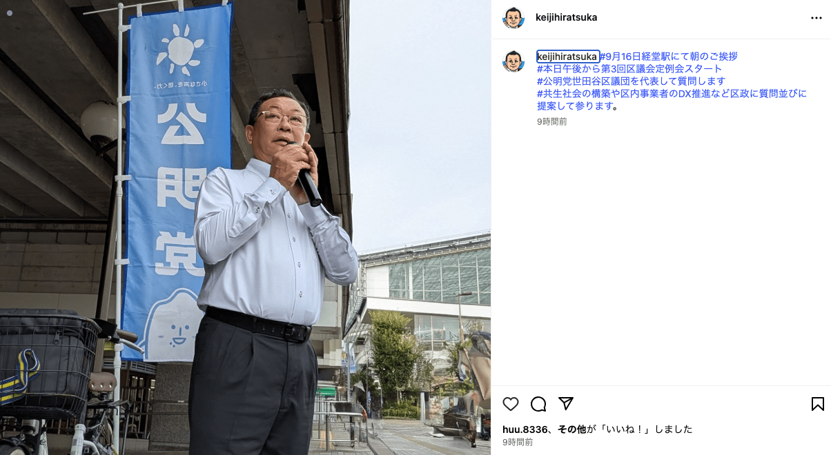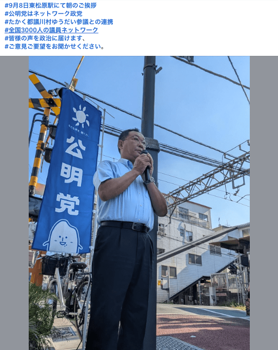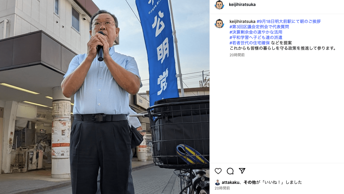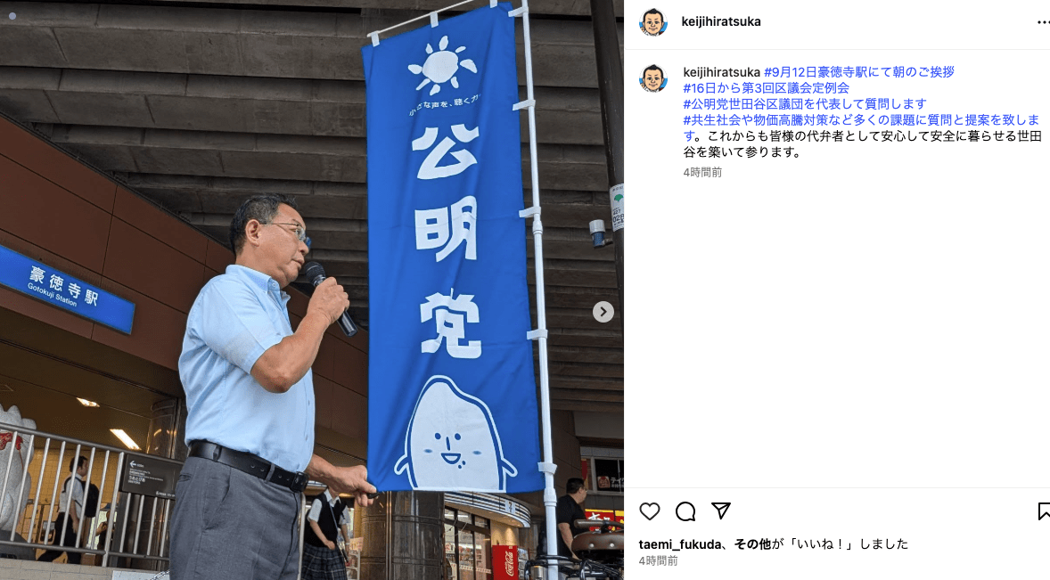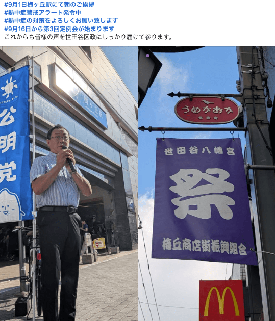 ご挨拶では、平和学習へ子どもたちの派遣や、若者世代の住宅確保など多岐に渡る提案を令和7年世田谷区議会第3回定例会で公明党区議団から代表質問でさせていただいた事を報告。