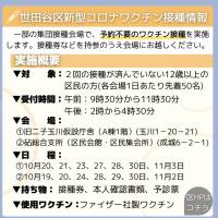 世田谷区ワクチン接種情報が配信されました。 一部の会場では予約無しで接種が受けられます。 詳しくは、世田谷区のホームページをご確認ください。 ※画像をクリックすると世田谷区のホームページにリンクしています。